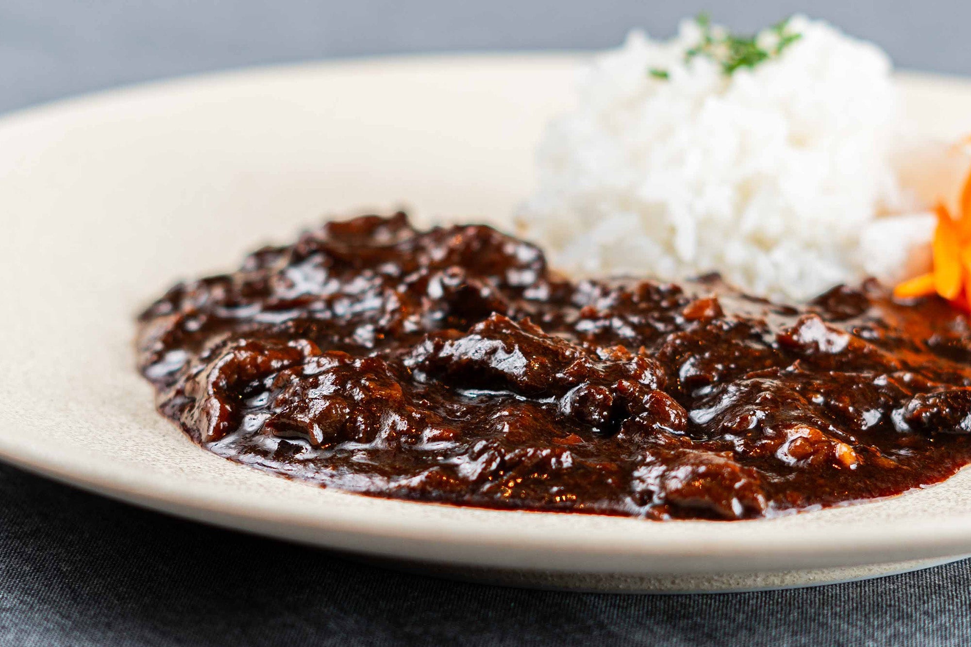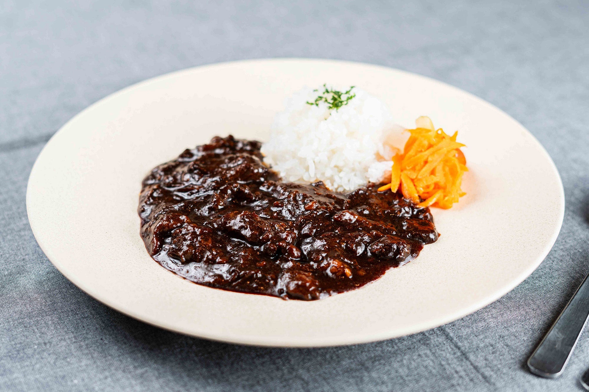 口当たりなめらかな野菜と、とろけるように柔らかく煮込まれた牛肉が、深いコクと豊かな風味を引き立てます。