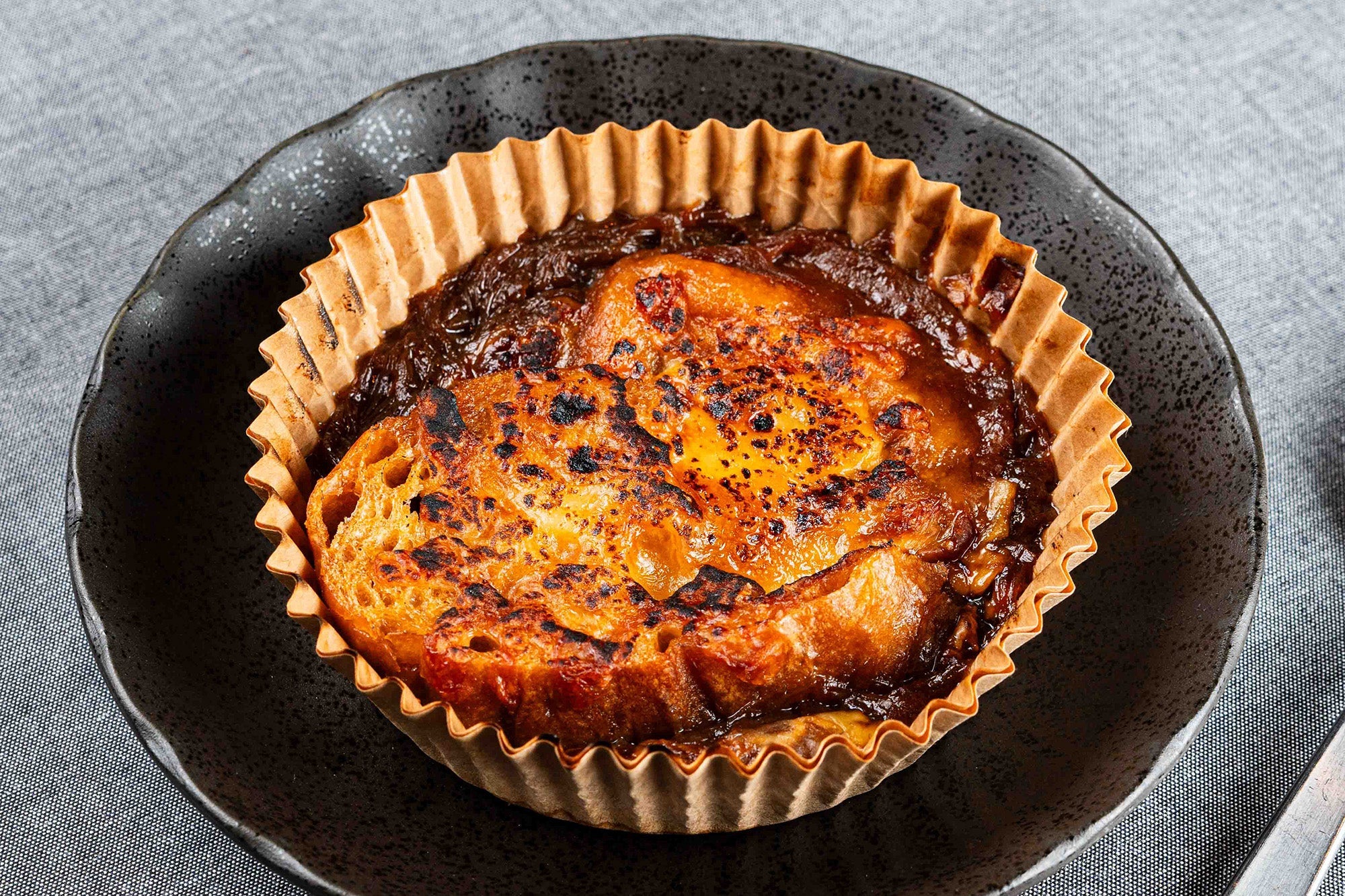そこへワインやバルサミコ酢を加えて煮込み、スープに浸したバゲットとチーズをのせ、こんがり焼き上げて仕上げました。